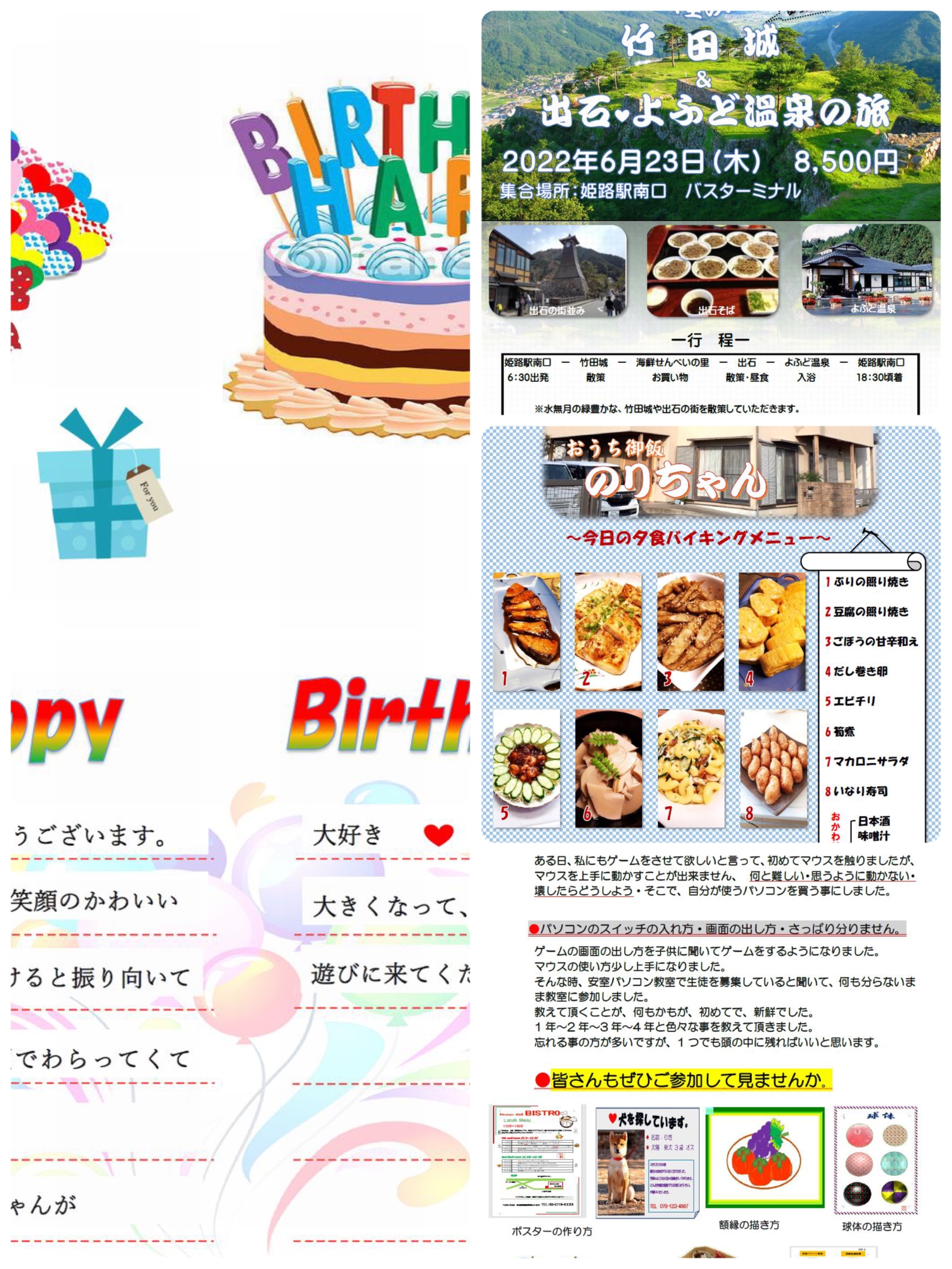 作品集をアップしました。(安室復習)2022年8月17日2022年8月25日 安室公民館での復習講座受講生が、Wordで自由に文書作りやお絵描きに取り組みました。作品を披露します。 画像のところをクリックすると大きく表示します。 (1)Iさん 生徒募集 (2)Yさん おうち御飯 (3)Yさん バスツアー (4)Iさん Happy Birthday 1 (5)Iさん Happy Birthday 2 HPAC,yasumuro2022